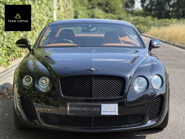 Unveiled in 2003 at the Geneva Motor Show, the Continental GT was a different animal. The Crewe-built cars numbers were impressive with the twin-turbo, VAG 6.0 litre W12 engines, developed in the VW Phaeton and stillborn W12 sports car, producing 552bhp and 479lb ft torque. This prodigious output was fed through a six-speed automatic box from the new A8 and distributed by the Quattro four-wheel drive system. 0-60 in 4.7 seconds and a top speed of 196mph were significant for a car of this stature. Some six years later, also in Geneva, Bentley unveiled their new 621bhp Continental Supersports which was indecently quick with 0-60mph in 3.7 seconds and a top speed of 204 mph, making it the fastest and the most powerful production Bentley ever. With a revised 'Tiptronic' automatic gearbox employing a 'quick-shift' system, gear change times were reduced by 50%. In order to cope with the increased power, it was necessary to have carbon fibre reinforced silicon carbide ceramic disc brakes - the largest and most powerful brakes ever fitted to a production car. As the Supersports evolved Bentley managed to accidentally create a very limited-edition car, the two seat examples were not selling as hoped because at the time most of the Bentley ownership comprised a demographic of drivers who wanted four seats and a softer ride. Enter the SuperSport ‘comfort seat’ option, a four-seat option that still gave performance, clearly not that of the two-seater but it gave a very clean way for Bentley to exit what appeared to be a fabulous car but not for their then customer demographic, thus leaving those with the full two-seat example with a low production car and now highly desirable. This stunning low mileage Bentley Continental Supersports is a 2010, UK supplied, right hand drive example finished in metallic Onyx Black with Beluga and Newmarket tan leather trim. Presented with a pair of heated, two-piece, carbon fibre sports seats and Breitling analogue clock sitting above the £5,000 uprated NAIM premium satellite navigation by Bentley Bristol. Upgrades by Bentley have not stopped there, originally a Bentley Pangbourne demonstrator car, as many options as possible were specified including a Bentley warrantied and fitted Acropovic exhaust system which was circa £7,000 alone and added between 7-12bhp along with an uprated leather steering wheel. Where rear passengers would normally reside, a carbon fibre cross-brace spans the cabin, generating torsional rigidity, showing the real intent of the 'Supersports', this is a rarity now as many cars were converted by Bentley to four seat cars to help sales. Sitting on 20" alloy wheels, the car is fitted with carbon-ceramic brakes, adjustable suspension and a host of other options making it, effectively, a very luxurious 'Group A Touring Car' for the road with incredible power. Serviced at 98, 344, 2550, 3559, 4592, 5079, 5992, 7402, 11745, 13567, 16702, 18473, 20713 and 21399 – boasting an all-Bentley main dealer history, the latest the larger of the scheduled carried out in February 2024. Supplied with its driver's manuals, spare keys, service book and a UK V5C registration document,this fantastically quick car would put a smile on any driver's face. We welcome any inspection of this amazing, showroom condition, Bentley with the W12 cherished plate included in the sale.